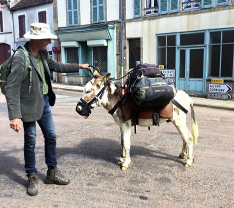 pèlerin avec son mulet, un espace vert clôt juste à côté du gite est